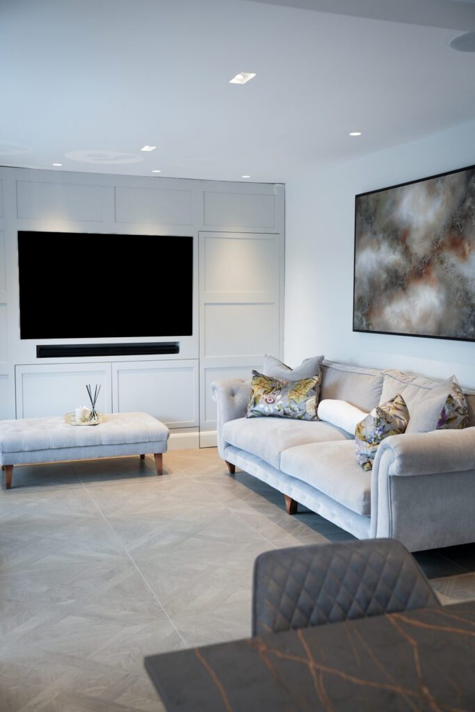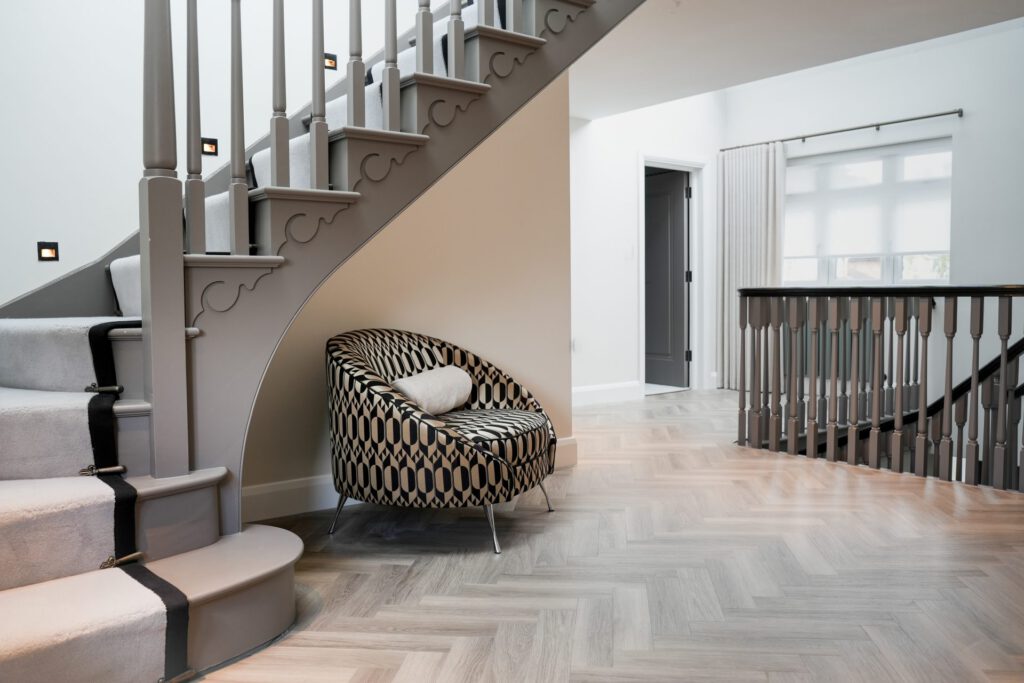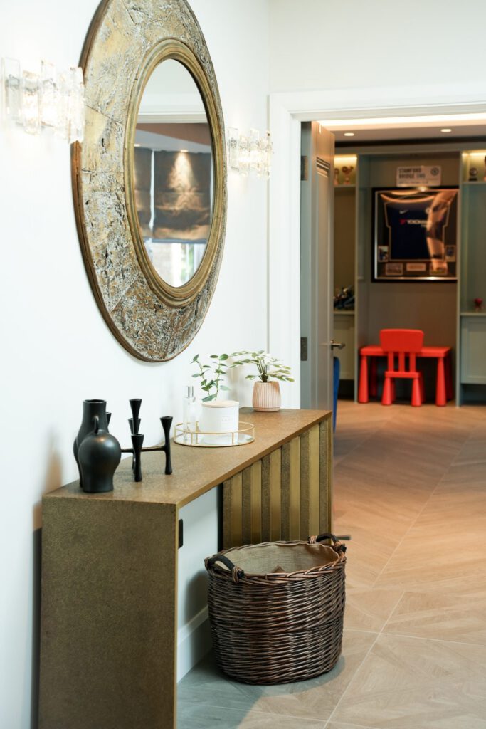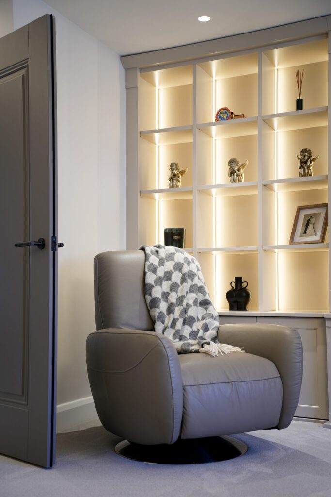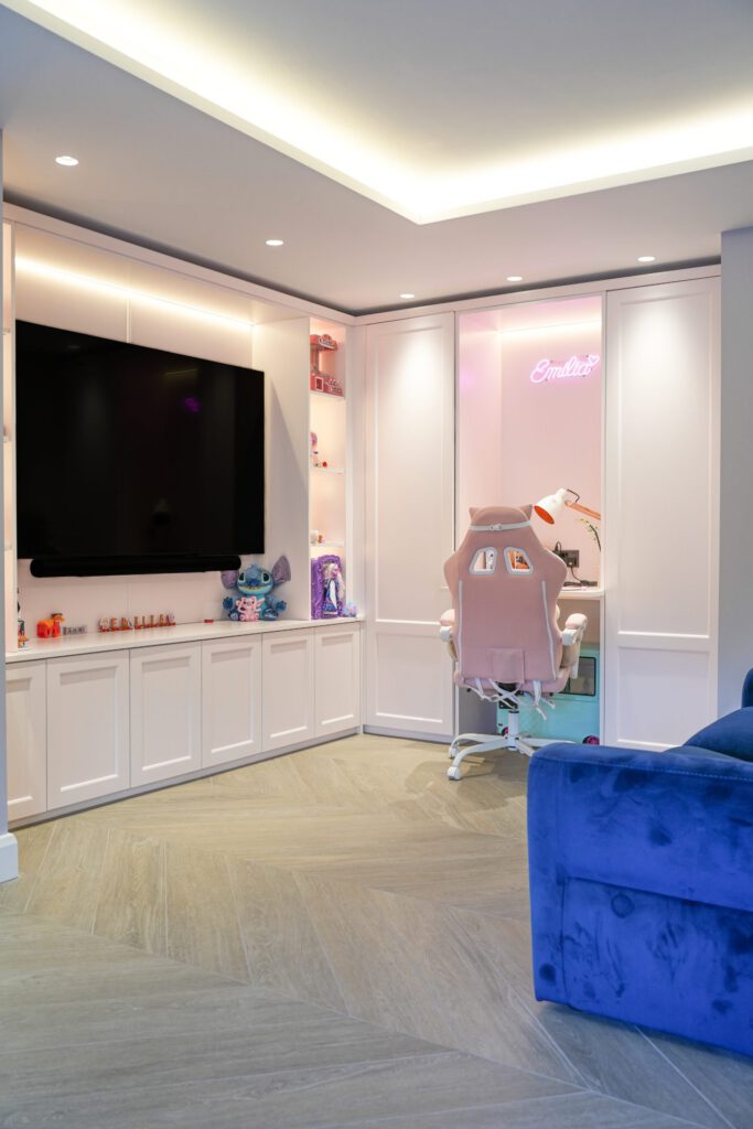 The interior design was guided by a desire for calm, relaxing spaces with thoughtful pops of colour. The clients wished to retain some of their existing furniture, which we carefully integrated into the new design. In some areas, like the children’s playroom, we had full creative freedom, resulting in a vibrant, playful haven bursting with colour and character.